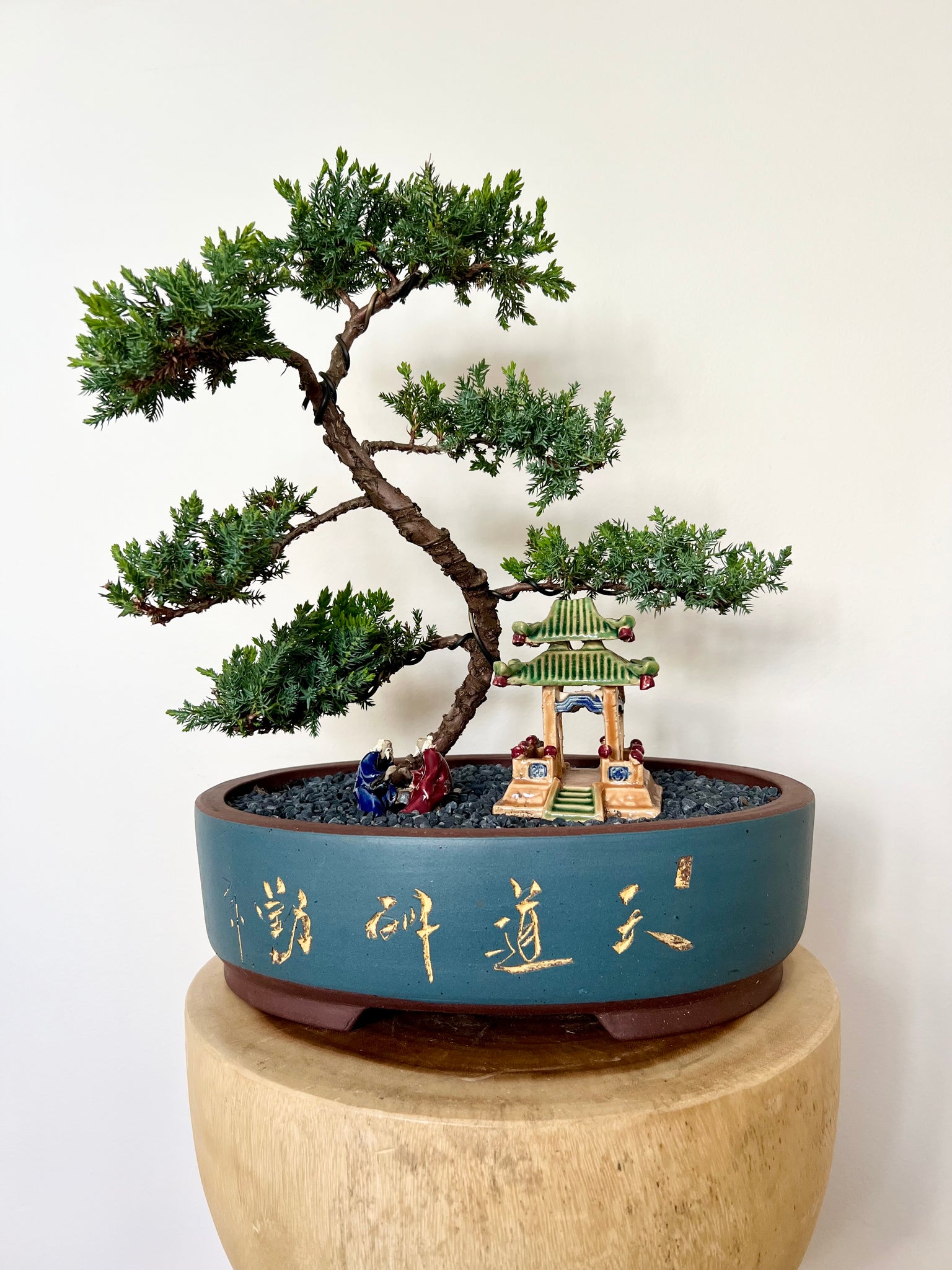 Highly sought after juniper bonsai roughly 45cm tall housed in a unique 32cm wide handmade zisha clay bonsai pot with drainage hole.
