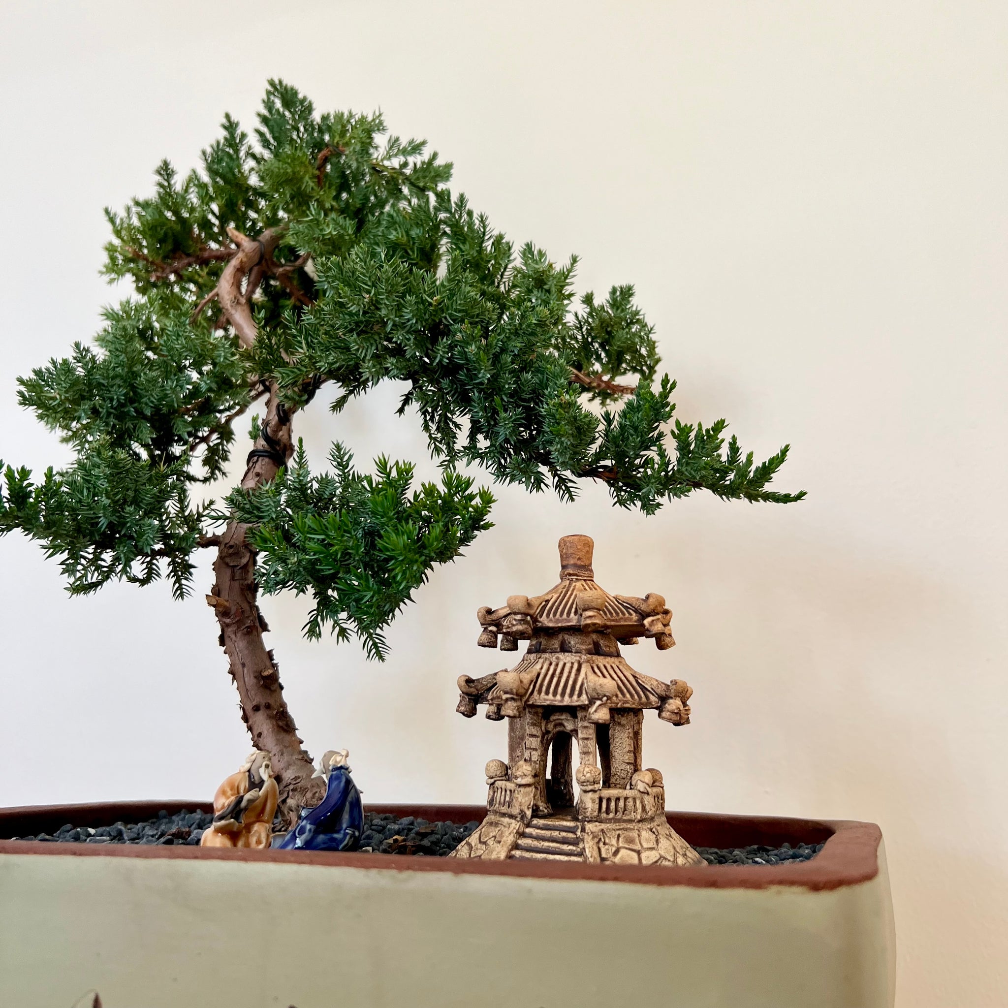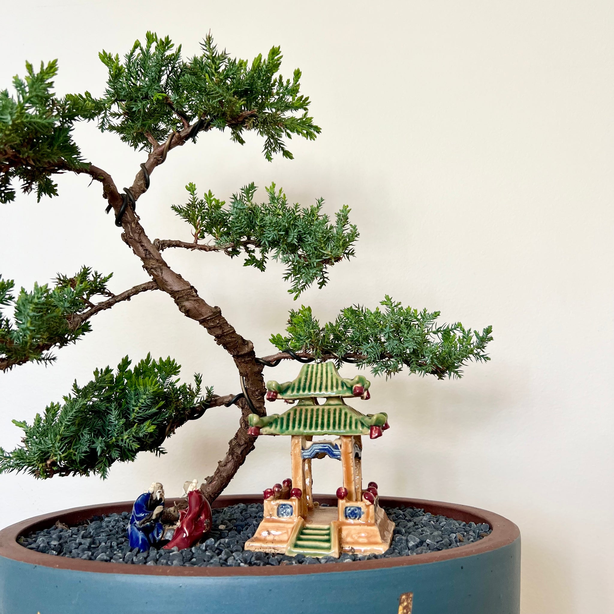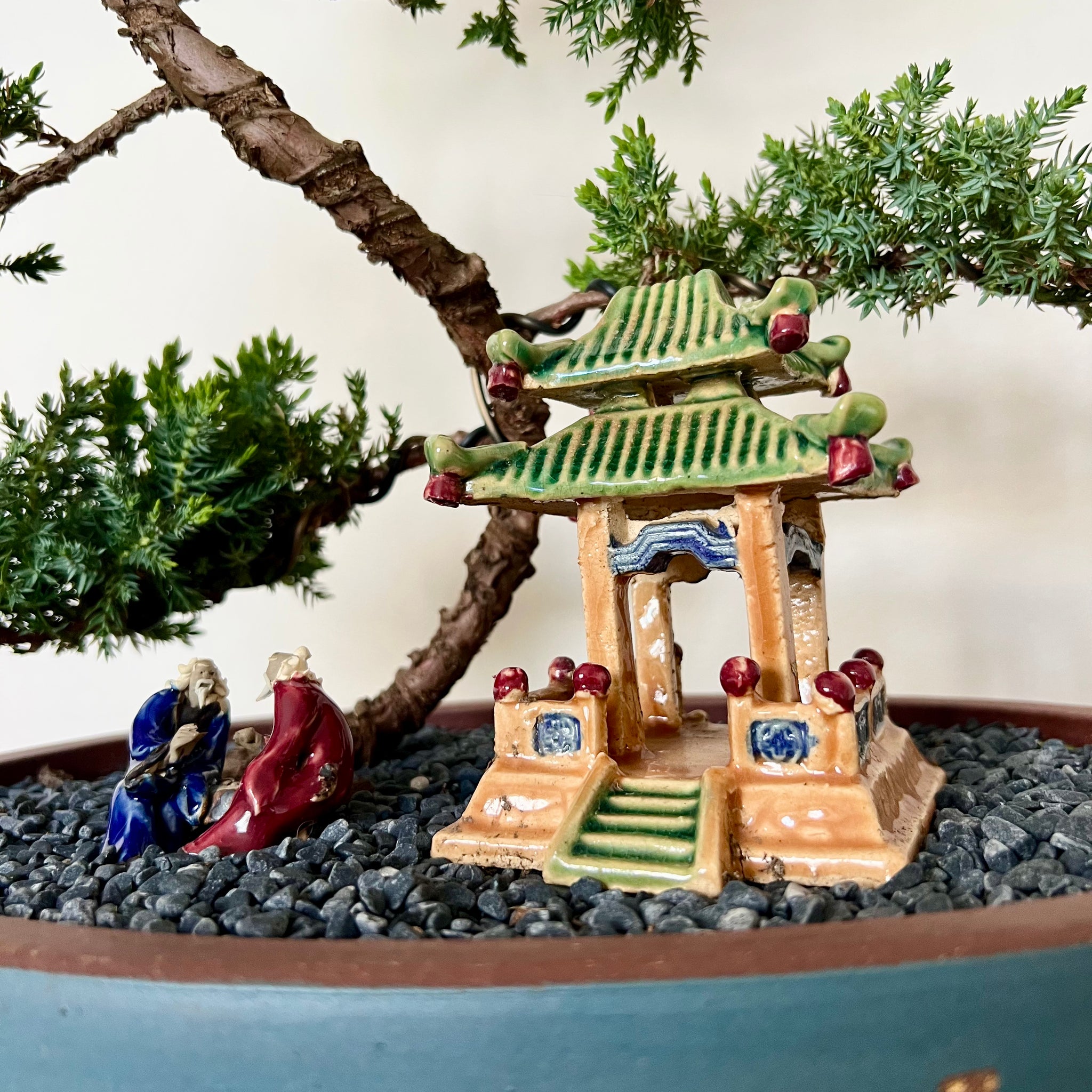 Hardy and low maintenance, perfect for a beginner's bonsai. Comes with bonus ceramic elders figurine and pergola to add a touch of zen.