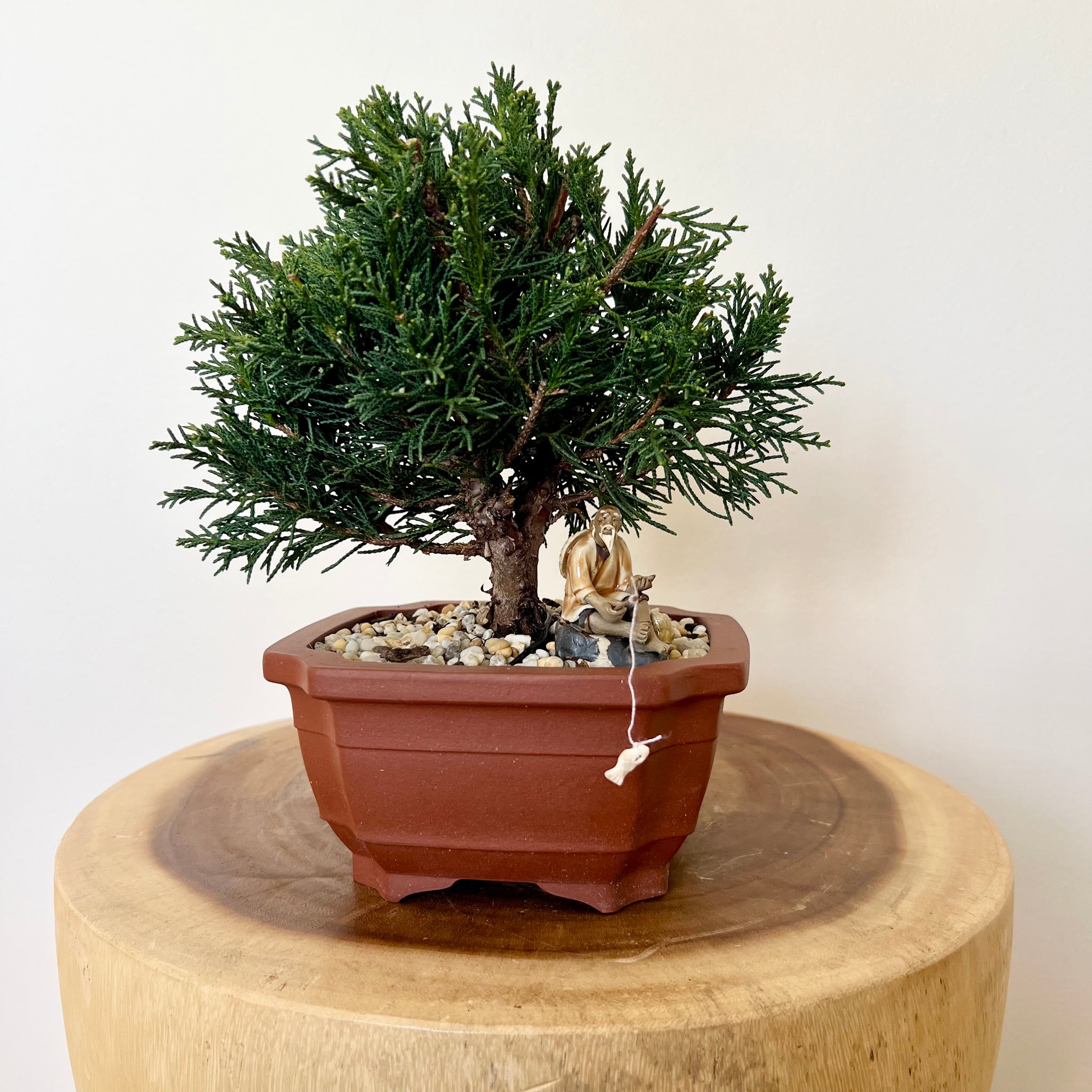 Hardy and low maintenance, perfect for a beginner's bonsai. Comes with bonus ceramic elder figurine to add a touch of character.