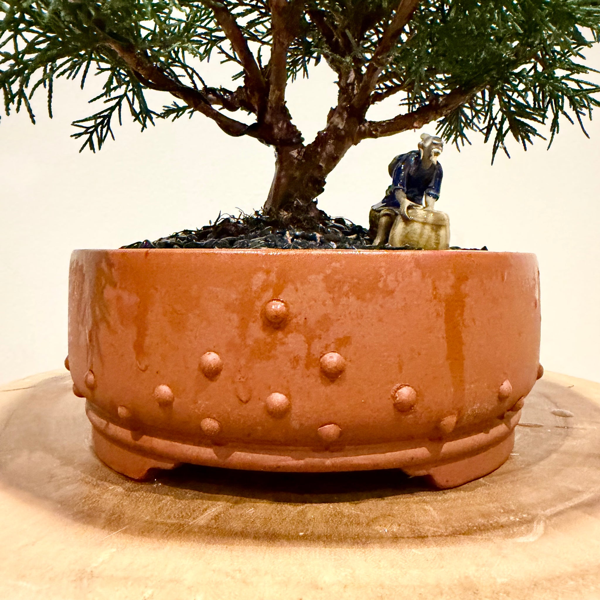 Highly sought after juniper bonsai roughly 26cm tall housed in a unique 17cm wide handmade ceramic bonsai pot with drainage hole.