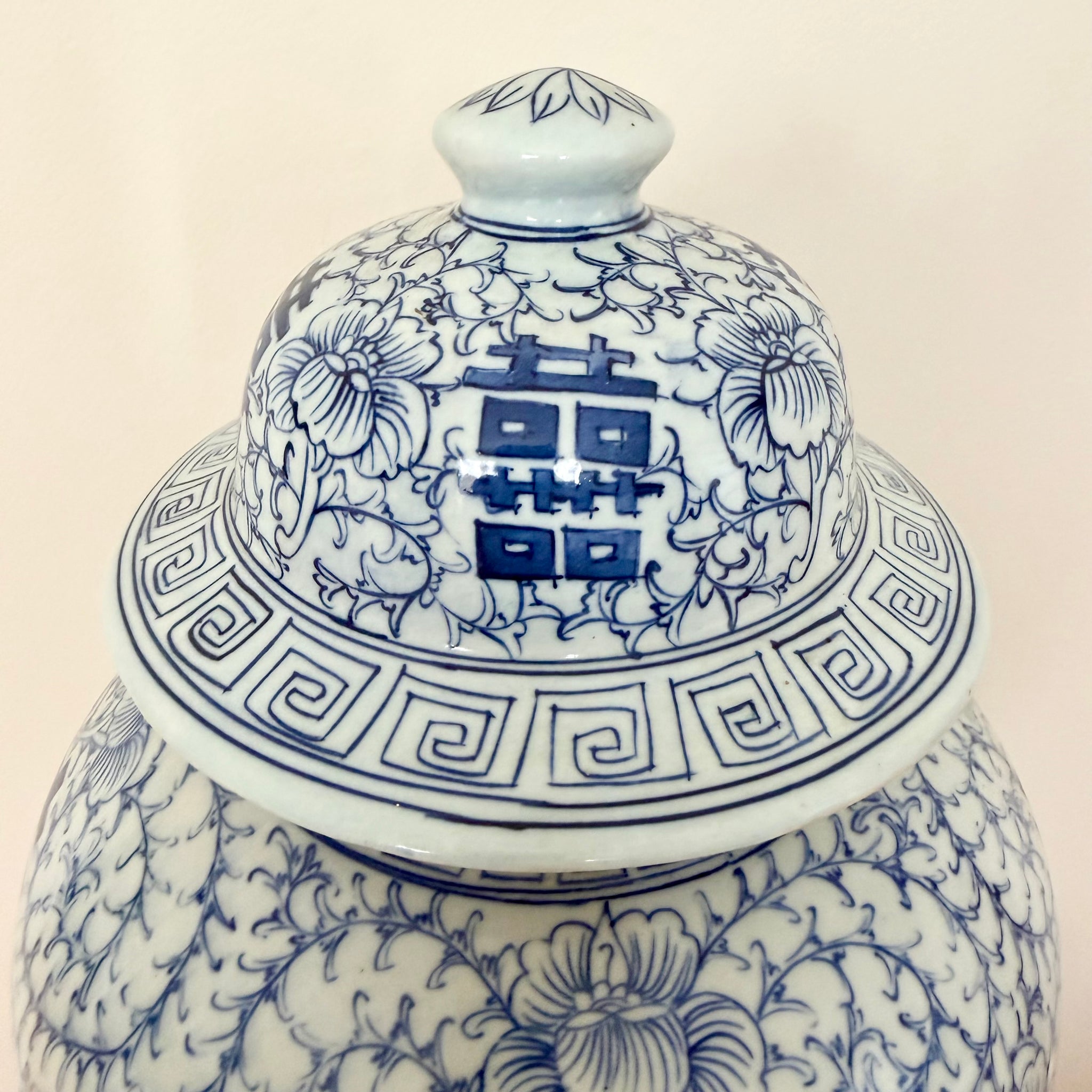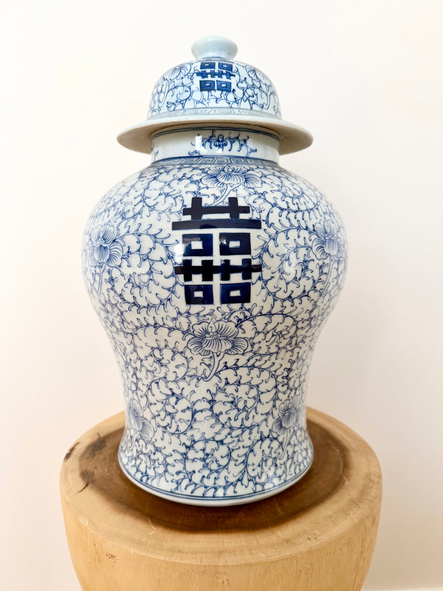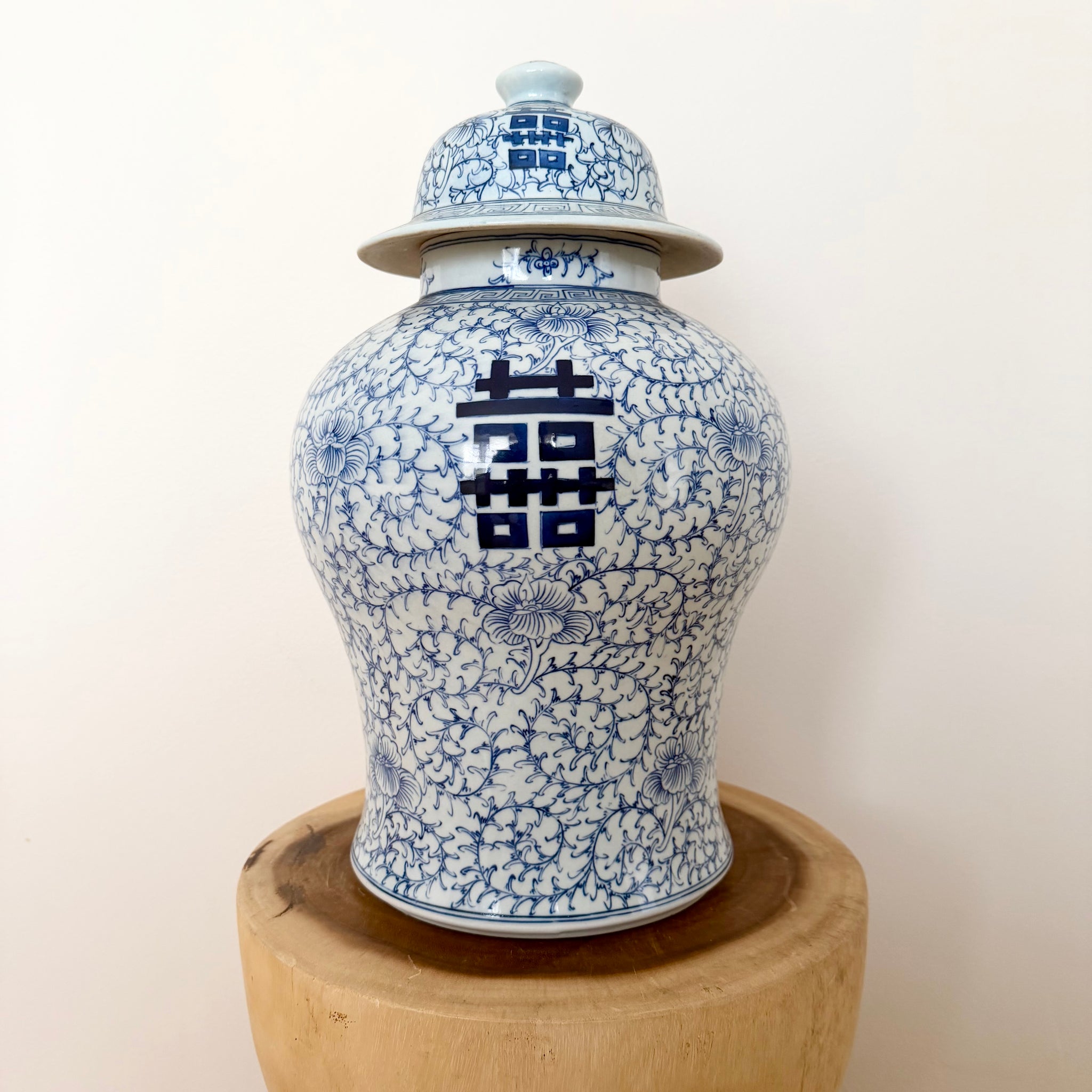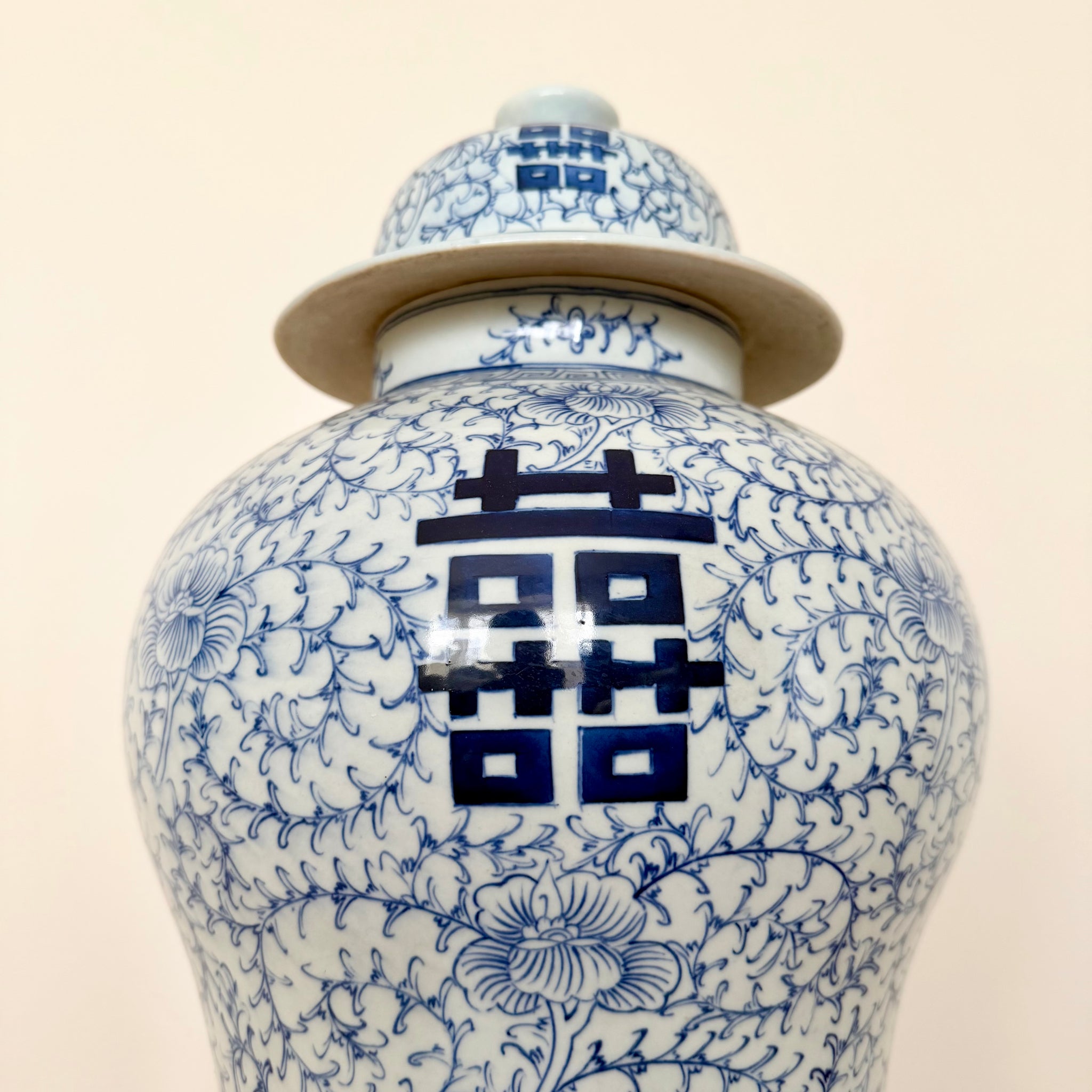 Classic blue and white porcelain ginger jar decorated with intricately handpainted floral patterns and auspicious double happiness signs.