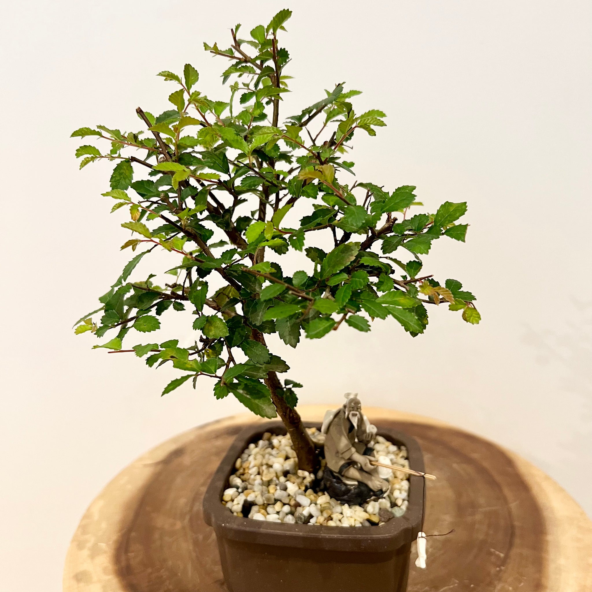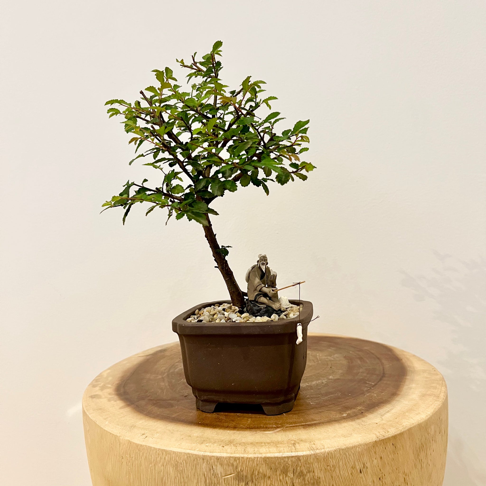 Hardy and low maintenance, perfect for a beginner's bonsai. Comes with bonus ceramic fisherman figurine to add a touch of zen.