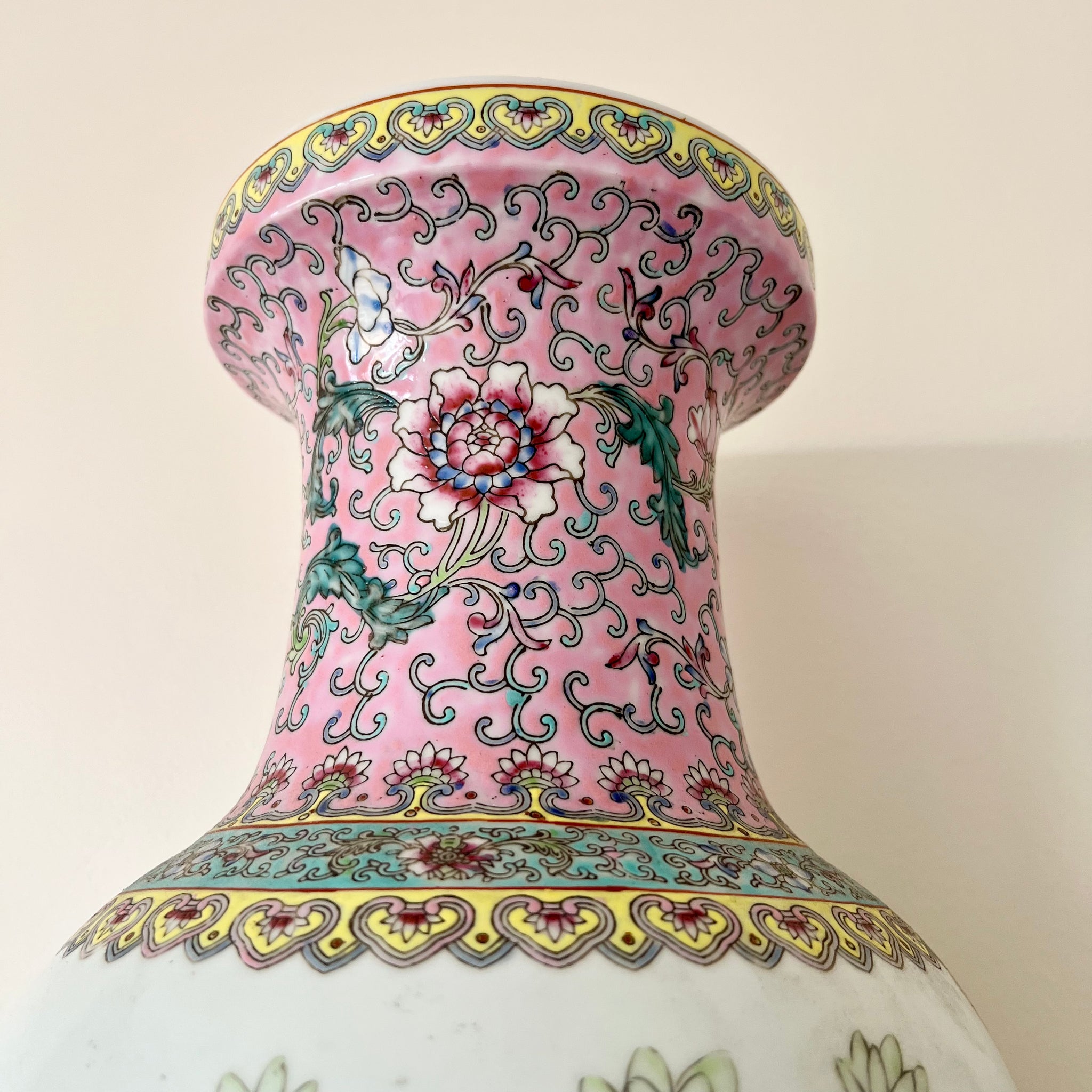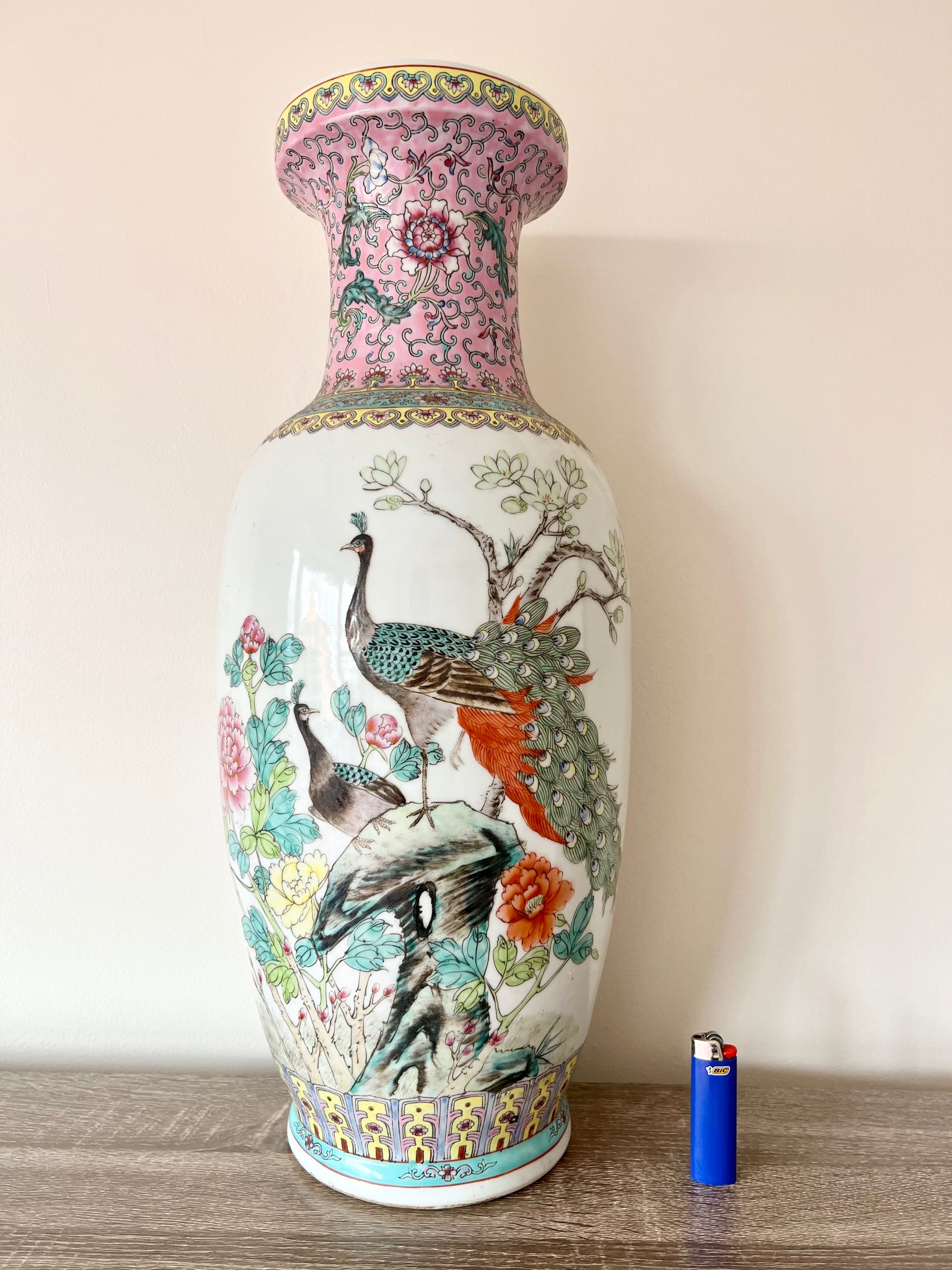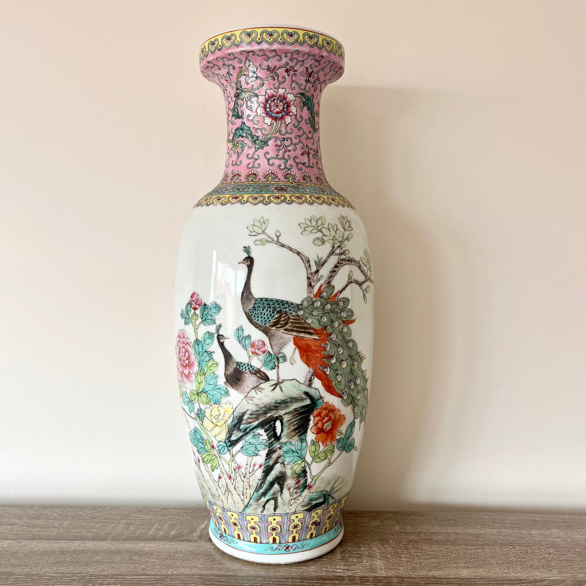 Vintage one of a kind handmade and hand painted porcelain vase detailed with decorative interlacing floral patterns. It depicts a springtime scenery of a peacock and pen hen in courtship; a symbol of fertility and growth.
